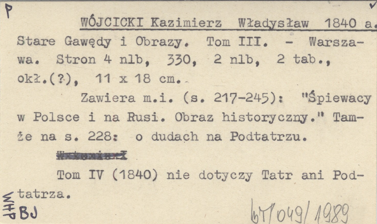 Warszawa , [6] s., 330 s., 2 k. tabl., okł. (?), 11x18 cm. Zawiera m.i. (s. 217-245): "Śpiewacy w Polsce i na Rusi. Obraz historyczny." Tamże na s. 228: o dudach na Podtatrzu. Tom IV (1840) nie dotyczy Tatr ani Podtatrza.
