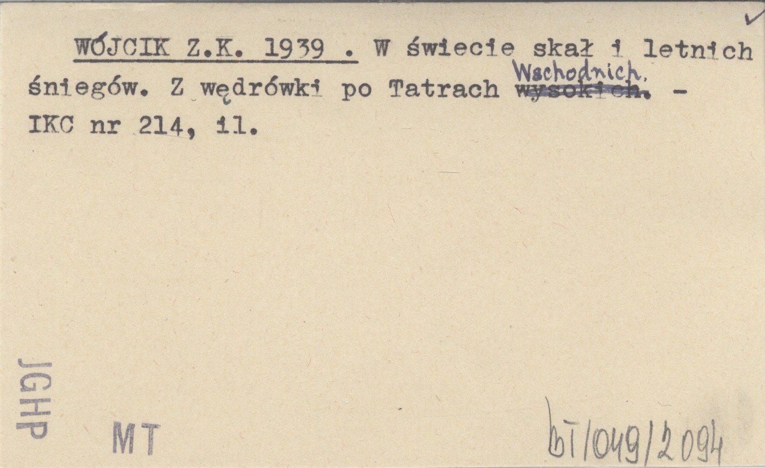 WÓJCIK Z.K. 1939 W świecie skał i letnich śniegów. Z wędrówki po Tatrach Wschodnich.