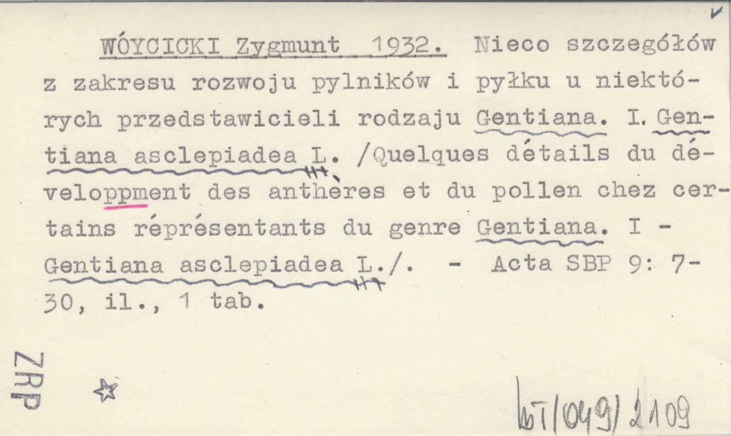 WÓYCICKI Zygmunt 1932 Nieco szczegółów z zakresu rozwoju pylników i pyłku u niektórych przedstawicieli rodzaju Gentiana. I. Gentiana asclepiadea L. (Quelques détails du développment des antheres et du pollen chez certains réprésentants du genre Gentiana. I - Gentiana asclepiadea L.).
