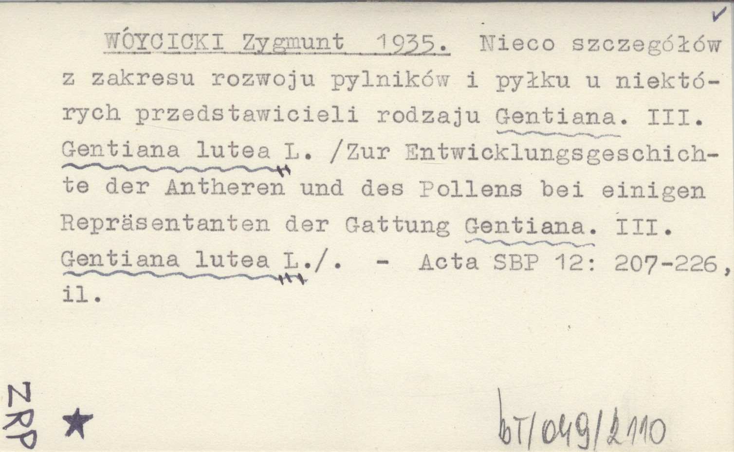 WÓYCICKI Zygmunt 1935 Nieco szczegółów z zakresu rozwoju pylników i pyłku u niektórych przedstawicieli rodzaju Gentiana. III. Gentiana lutea L. (Zur Entwicklungsgeschichte der Antheren und des Pollens bei einigen Repräsentanten der Gattung Gentiana. III. Gentiana lutea L.).