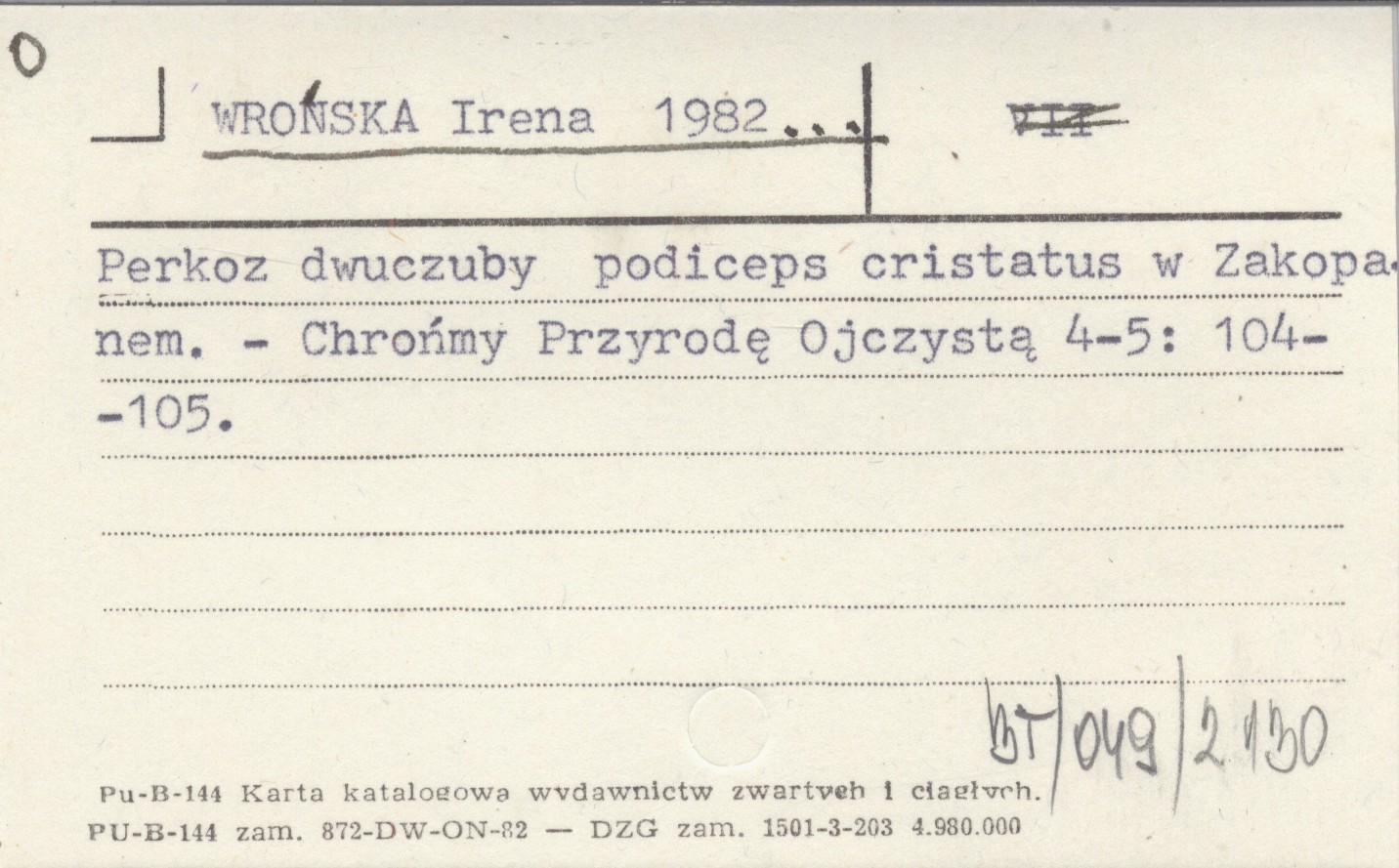 WROŃSKA Irena 1982... Perkoz dwuczuby podiceps cristatus w Zakopanem.
