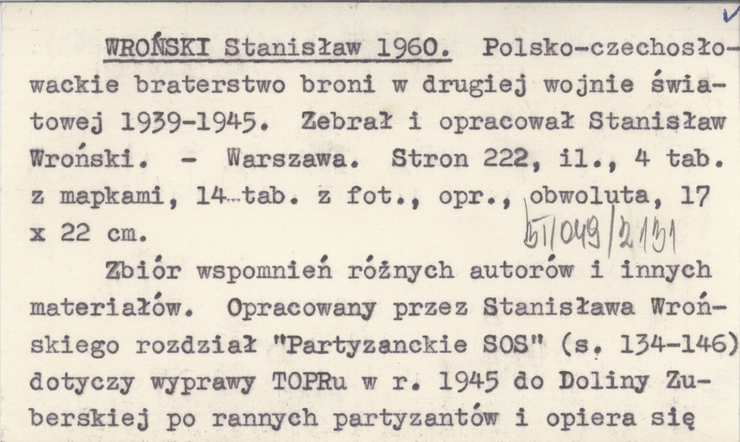Warszawa , 222 s., il., 18 k. tabl. (4 m., 14 fot.), opr., obw., 17x22 cm. Zbiór wspomnień różnych autorów i innych materiałów. Opracowany przez Stanisława Wrońskiego rozdział "Partyzanckie SOS" (s. 134-146) dotyczy wyprawy TOPRu w r. 1945 do Doliny Zuberskiej po rannych partyzantów i opiera się głównie na pozycji WNUK W. 1958 (s. 232-243).