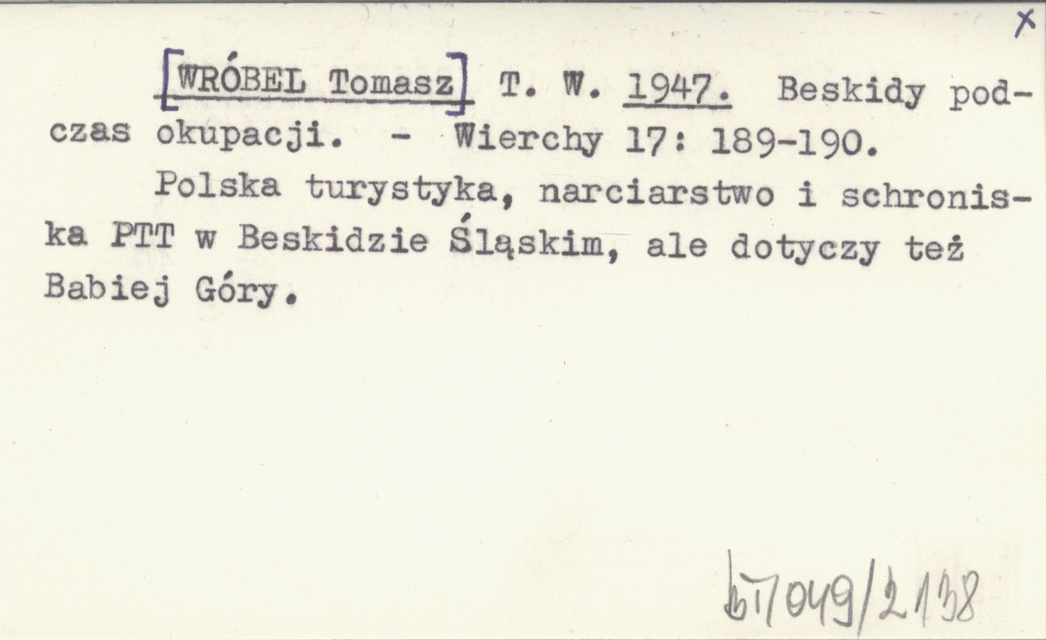 Wierchy, 17: 189-190. Polska turystyka, narciarstwo i schroniska PTT w Beskidzie Śląskim, ale dotyczy też Babiej Góry.