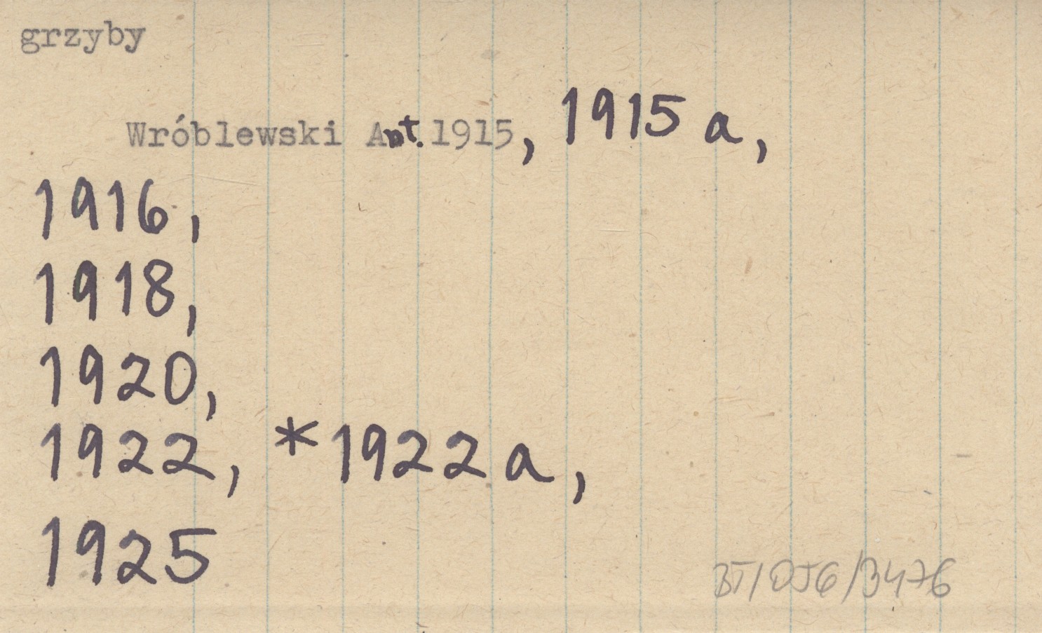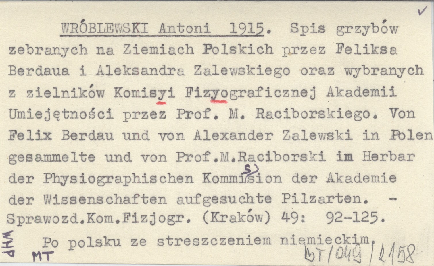 WRÓBLEWSKI Antoni 1915 Spis grzybów zebranych na Ziemiach Polskich przez Feliksa Berdaua i Aleksandra Zalewskiego oraz wybranych z zielników Komisyi Fizyograficznej Akademii Umiejętności przez Prof. M. Raciborskiego. Von Felix Berdau und von Alexander Zalewski in Polen gesammelte und von Prof.M.Raciborski im Herbar der Physiographischen Kommission der Akademie der Wissenschaften aufgesuchte Pilzarten.