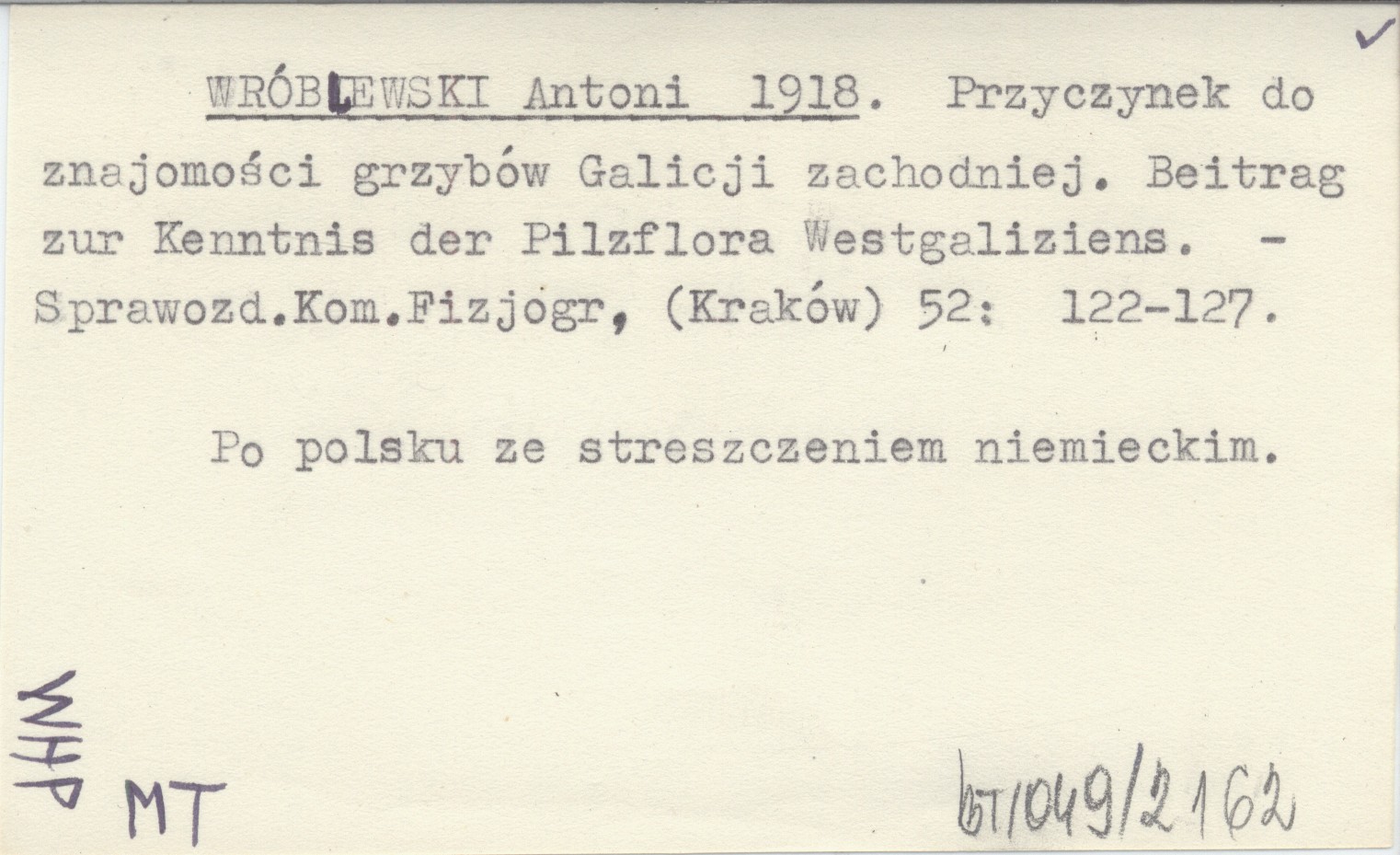 WRÓBLEWSKI Antoni 1918 Przyczynek do znajomości grzybów Galicji zachodniej. Beitrag zur Kenntnis der Pilzflora Westgaliziens.