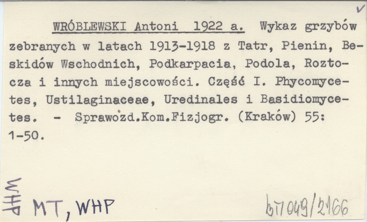 WRÓBLEWSKI Antoni 1922 a Wykaz grzybów zebranych w latach 1913-1918 z Tatr, Pienin, Beskidów Wschodnich, Podkarpacia, Podola, Roztocza i innych miejscowości. Część I. Phycomycetes, Ustilaginaceae, Uredinales i Basidiomycetes.