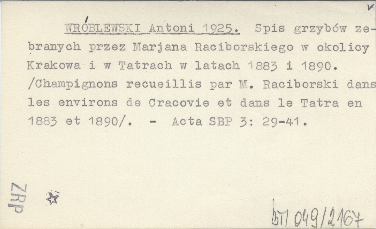 WRÓBLEWSKI Antoni 1925 Spis grzybów zebranych przez Marjana Raciborskiego w okolicy Krakowa i w Tatrach w latach 1883 i 1890. (Champignons recueillis par M. Raciborski dans les environs de Cracovie et dans le Tatra en 1883 et 1890).