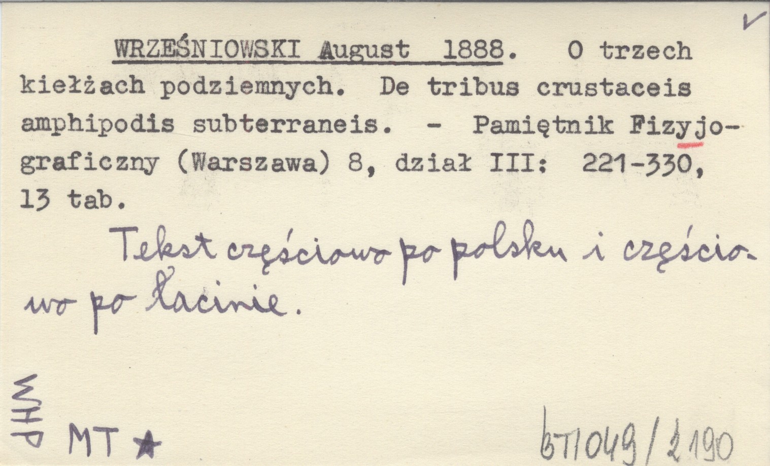 WRZEŚNIOWSKI August 1888 O trzech kiełżach podziemnych. De tribus crustaceis amphipodis subterraneis.