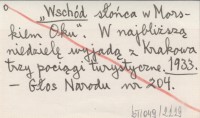 "Wschód słońca w Morskiem Oku". W najbliższą niedzielę wyjadą z Krakowa trzy pociągi turystyczne. 1933