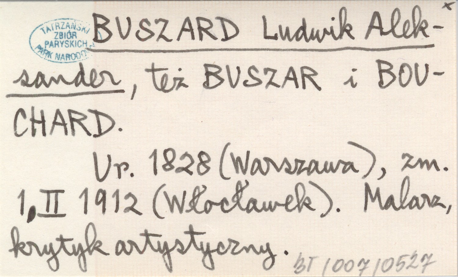 Też BUSZAR i BOUCHARD. Ur. 1828 (Warszawa), zm. 1 II 1912 (Włocławek). Malarz, krytyk artystyczny.