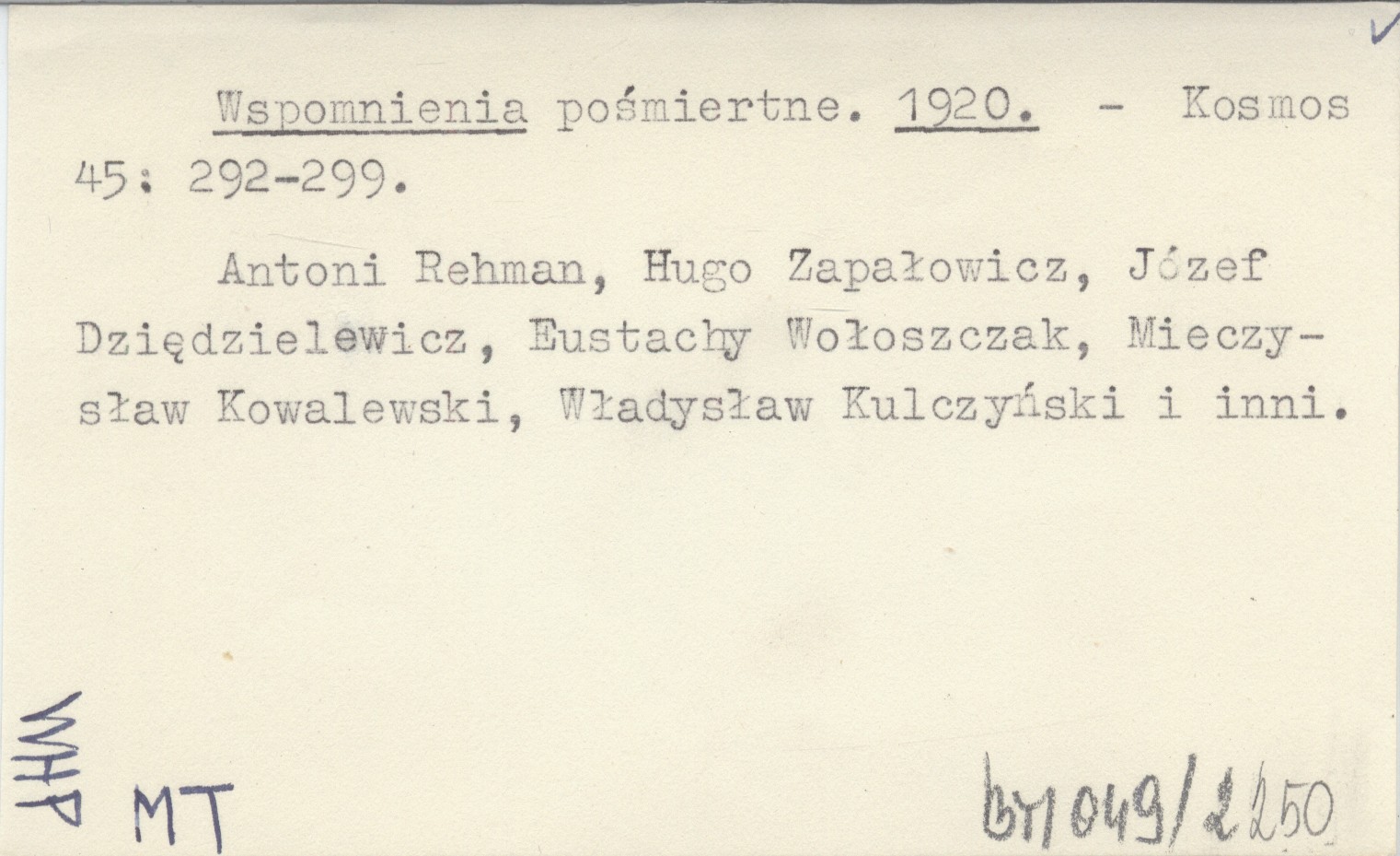 Kosmos, 45: 292-299. Antoni Rehman, Hugo Zapałowicz, Józef Dziędzielewicz, Eustachy Wołoszczak, Mieczysław Kowalewski, Władysław Kulczyński i inny.