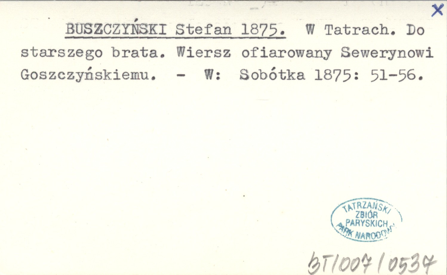 BUSZCZYŃSKI Stefan 1875 W Tatrach. Do starszego brata. Wiersz ofiarowany Sewerynowi Goszczyńskiemu.