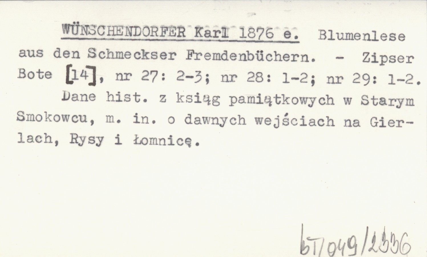 Zipser Bote, [14], nr 27: 2-3 ; nr 28: 1-2 ; nr 29: 1-2. Dane hist. z ksiąg pamiątkowych w Starym Smokowcu, m. in. o dawnych wejściach na Gierlach, Rysy i Łomnicę.