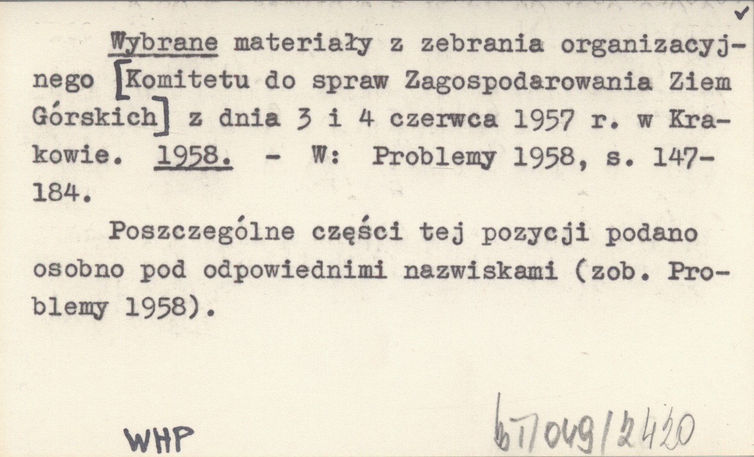 Wybrane materiały z zebrania organizacyjnego [Komitetu do spraw Zagospodarowania Ziem Górskich] z dnia 3 i 4 czerwca 1957 r. w Krakowie. 1958