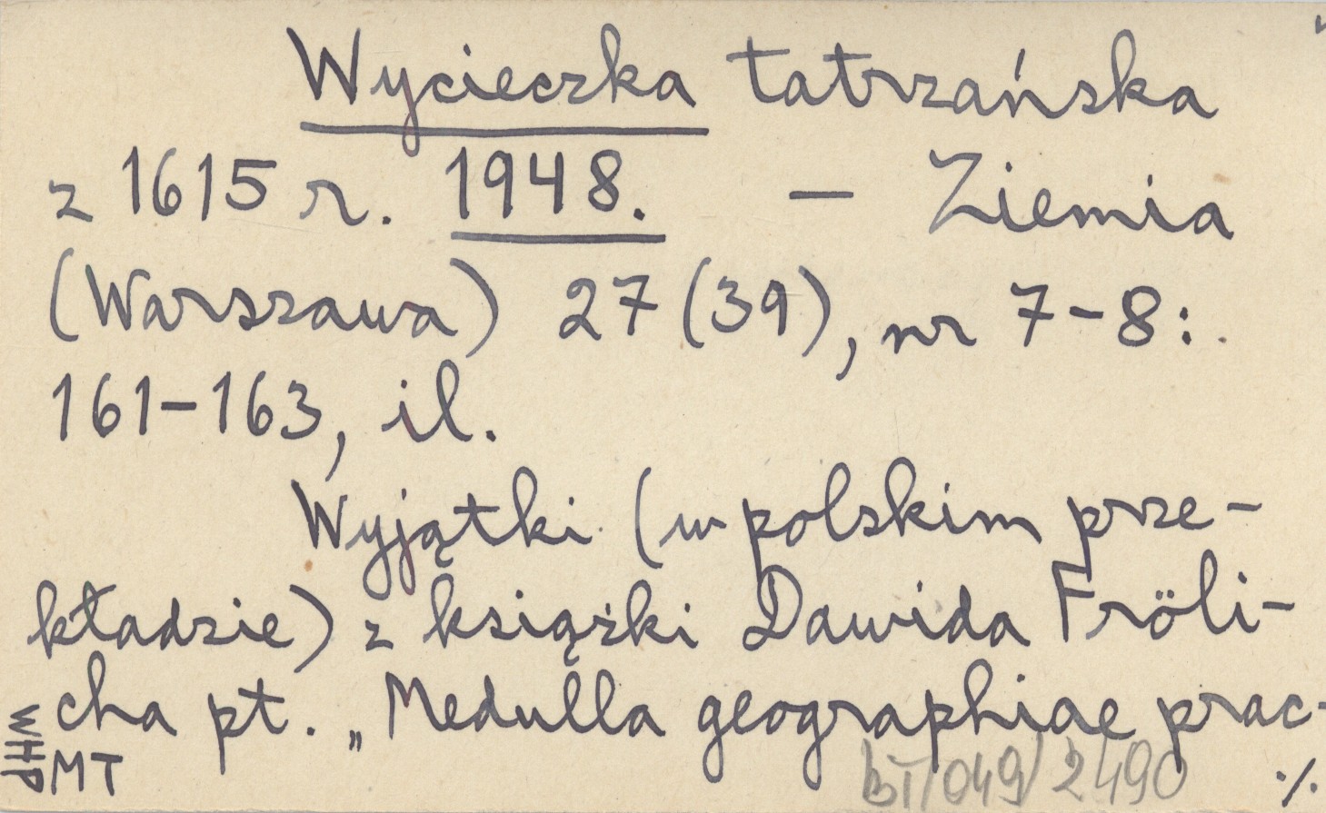Ziemia (Warszawa) , 27 (39), nr 7-8: 161-163, il. Wyjątki (w polskim przekładzie) z książki Dawida Frölicha pt. "Medulla geographiae practicae" (z r. 1639) z komentarzem oraz reprodukcje wycinków starych map z objaśnieniami.