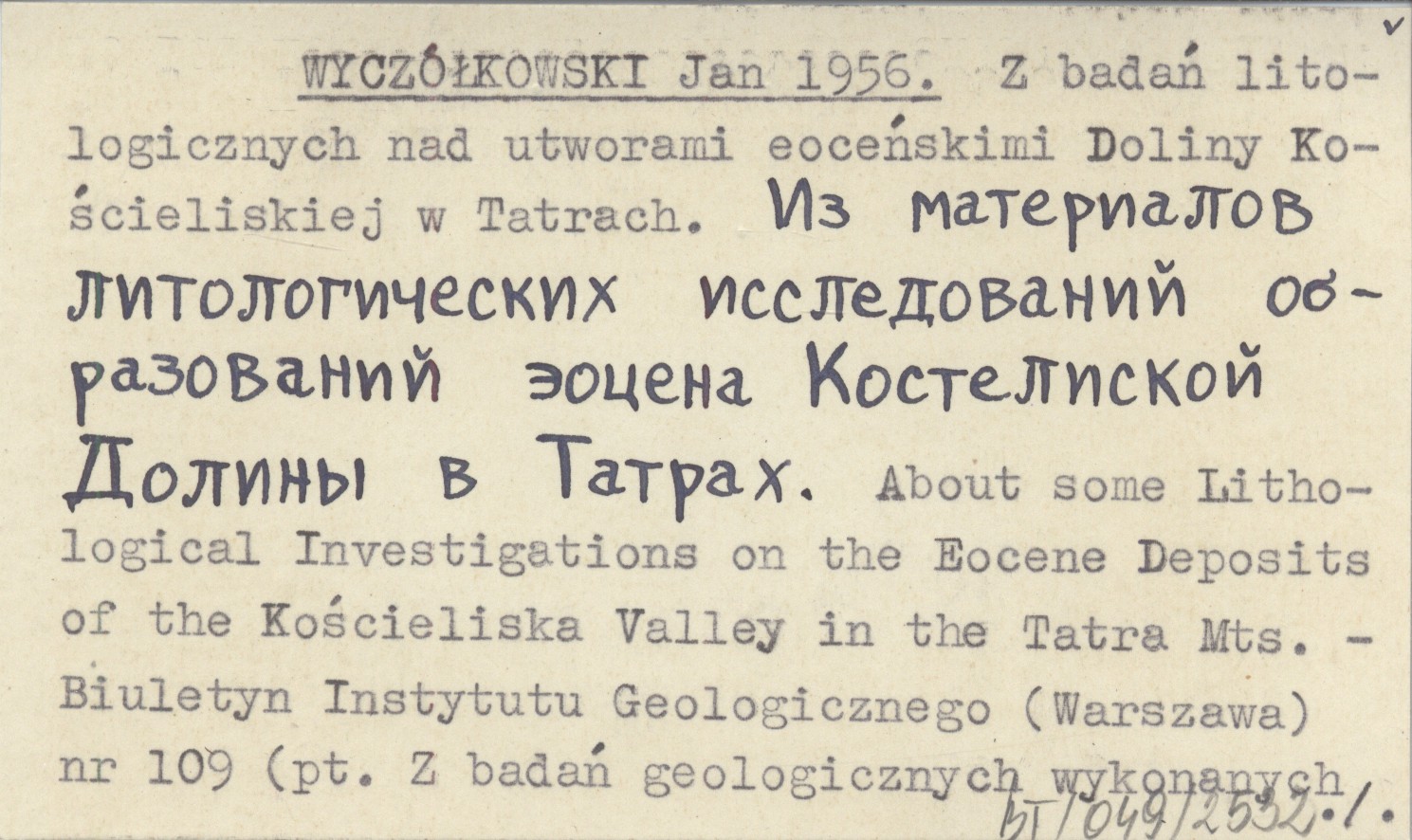 WYCZÓŁKOWSKI Jan 1956 Z badań litologicznych nad utworami eoceńskimi Doliny Kościeliskiej w Tatrach. Iz materialov litologičeskich issledovanij obrazobanij eocena Kosteliskoj Doliny v Tatrach. About some Lithological Investigations on the Eocene Deposits of the Kościeliska Valley in the Tatra Mts.