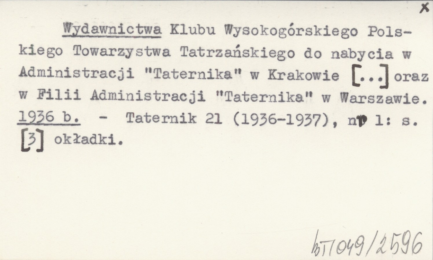 Wydawnictwa Klubu Wysokogórskiego Polskiego Towarzystwa Tatrzańskiego do nabycia w Administracji "Taternika" w Krakowie [...] oraz w Filii Administracji "Taternika" w Warszawie. 1936 b
