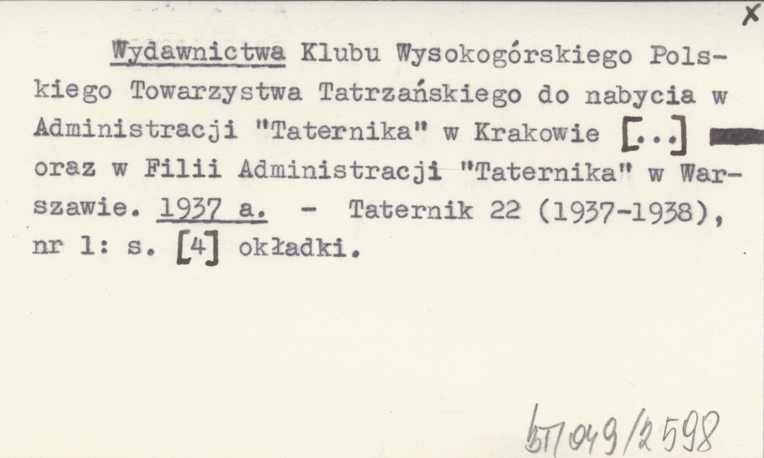 Wydawnictwa Klubu Wysokogórskiego Polskiego Towarzystwa Tatrzańskiego do nabycia w Administracji "Taternika" w Krakowie [...] oraz w Filii Administracji "Taternika" w Warszawie. 1937 a