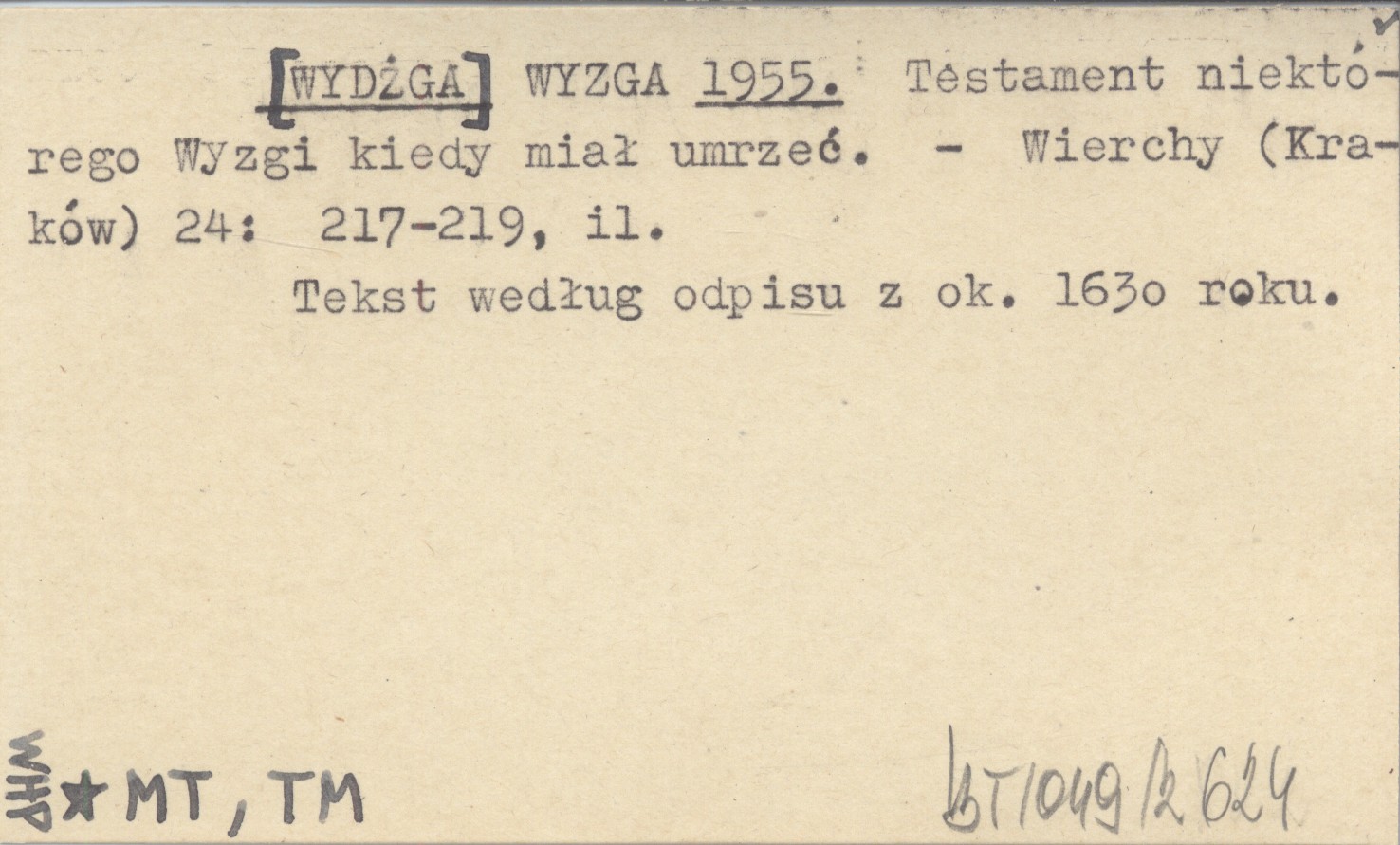 WYZGA [WYDŻGA] 1955 Testament niektórego Wyzgi kiedy miał umrzeć.