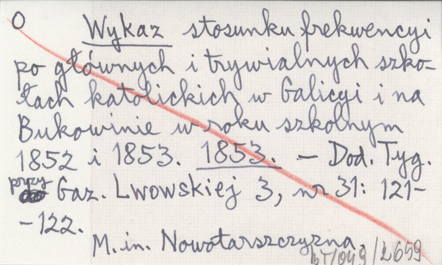 Wykaz stosunku frekwencyi po głównych i trywialnych szkołach katolickich w Galicyi i na Bukowinie w roku szkolnym 1852 i 1853. 1853