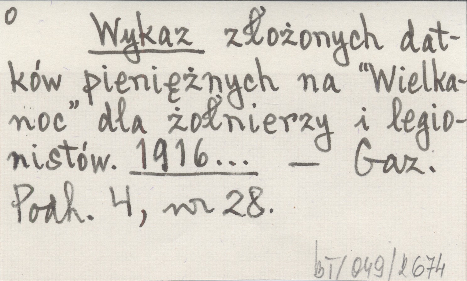 Wykaz złożonych datków pieniężnych na "Wielkanoc" dla żołnierzy i legionistów. 1916...