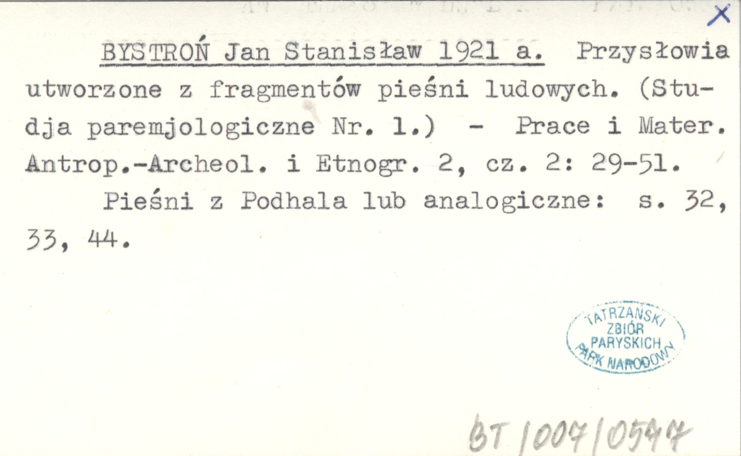 BYSTROŃ Jan Stanisław 1921 a Przysłowia utworzone z fragmentów pieśni ludowych. (Studja paremjologiczne Nr .1).