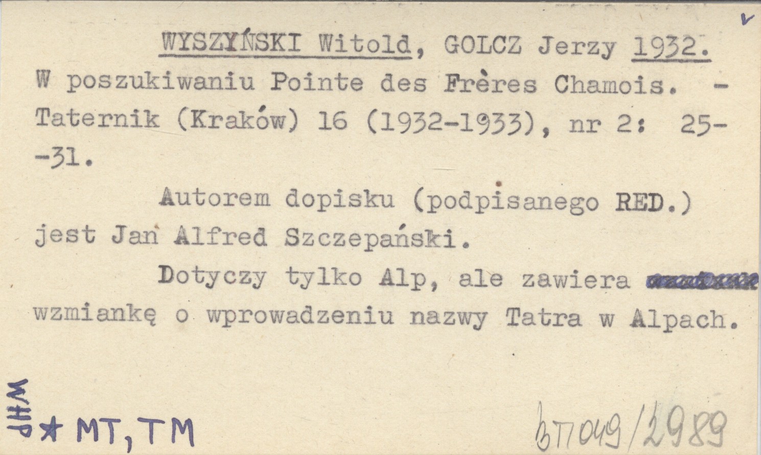 WYSZYŃSKI Witold GOLCZ, Jerzy. ; 1932 W poszukiwaniu Pointe des Fréres Chamois.