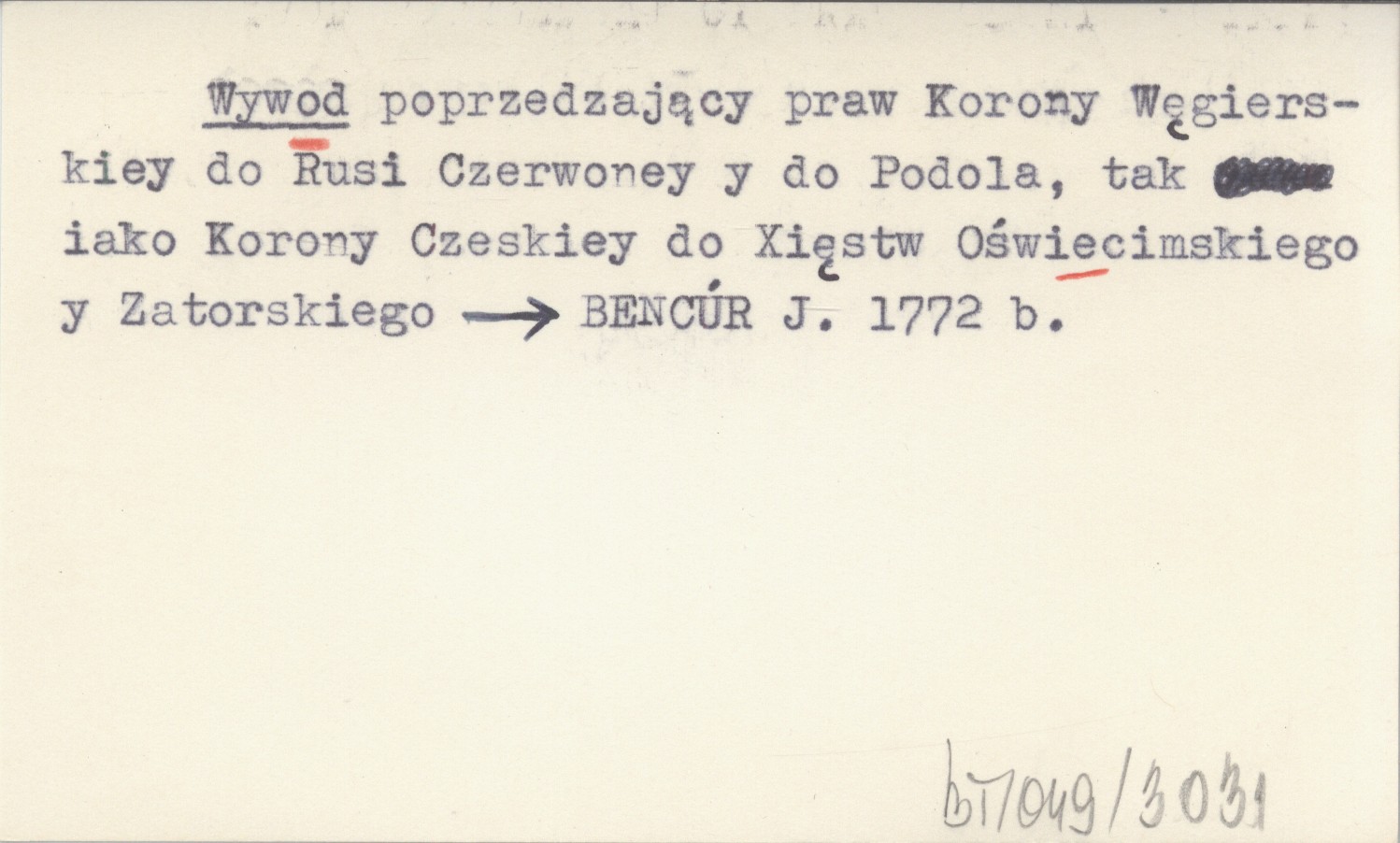 Wywod poprzedzający praw Korony Węgierskiey do Rusi Czerwoney y do Podola, tak iako Korony Czeskiey do Xięstw Oświecimskiego y Zatorskiego.