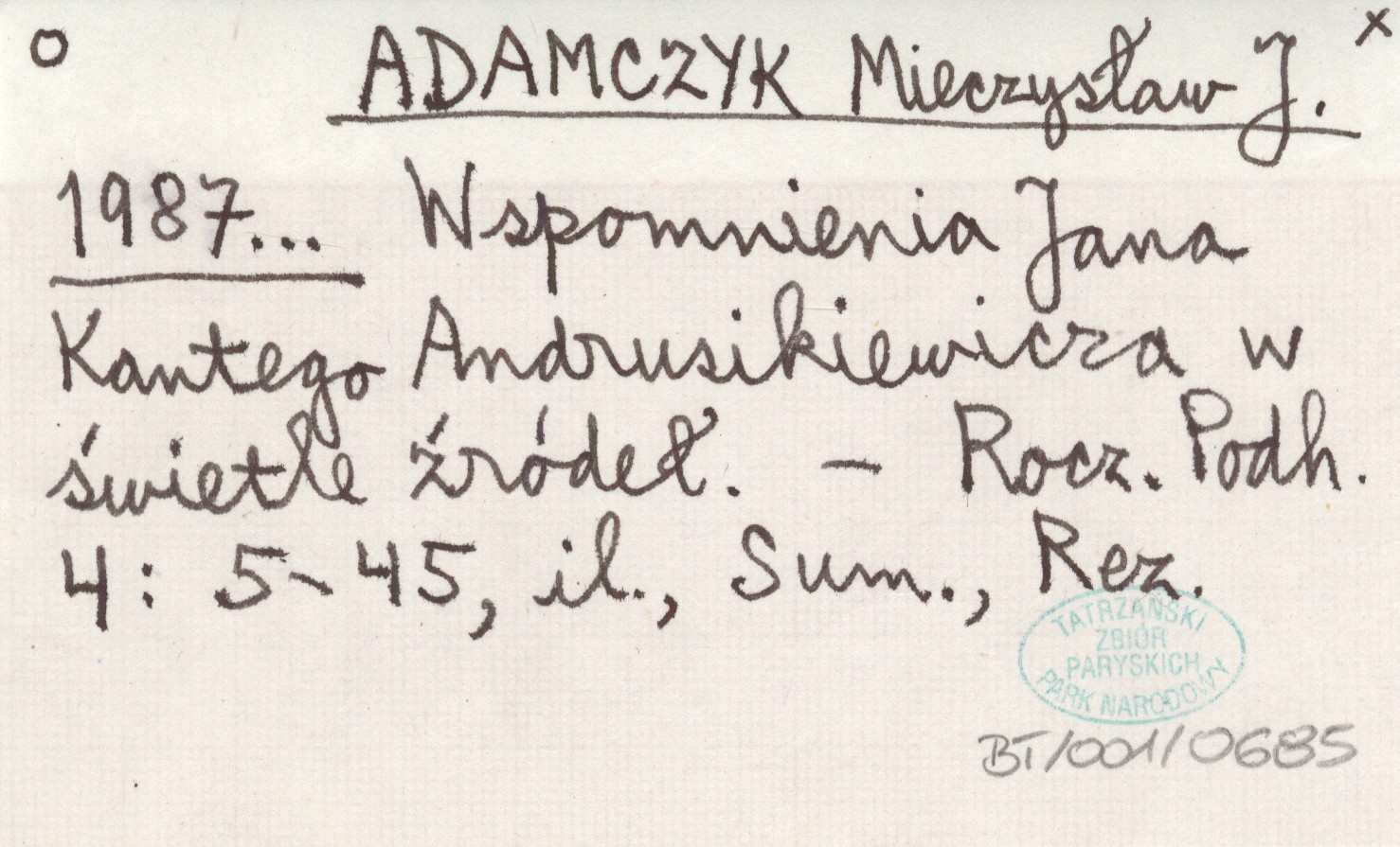 ADAMCZYK Mieczysław J. 1987... Wspomnienia Jana Kantego Andrusikiewicza w świetle źródeł.