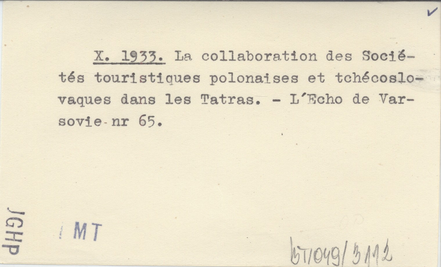 X. 1933 La collaboration des Sociétés touristiques polonaises et tchécoslovaques dans les Tatras.