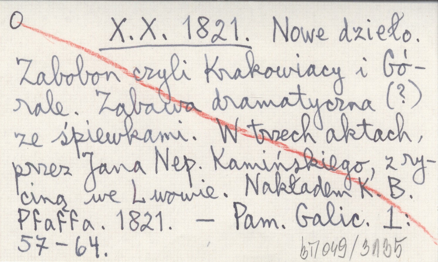 X. X. 1821 Nowe dzieło. Zabobon czyli Krakowiacy i Górale. Zabawa dramatyczna (?) ze śpiewkami. W trzech aktach, przez Jana Nep. Kamińskiego, z ryciną we Lwowie. Nakładem K. B. Pfaffa. 1821.
