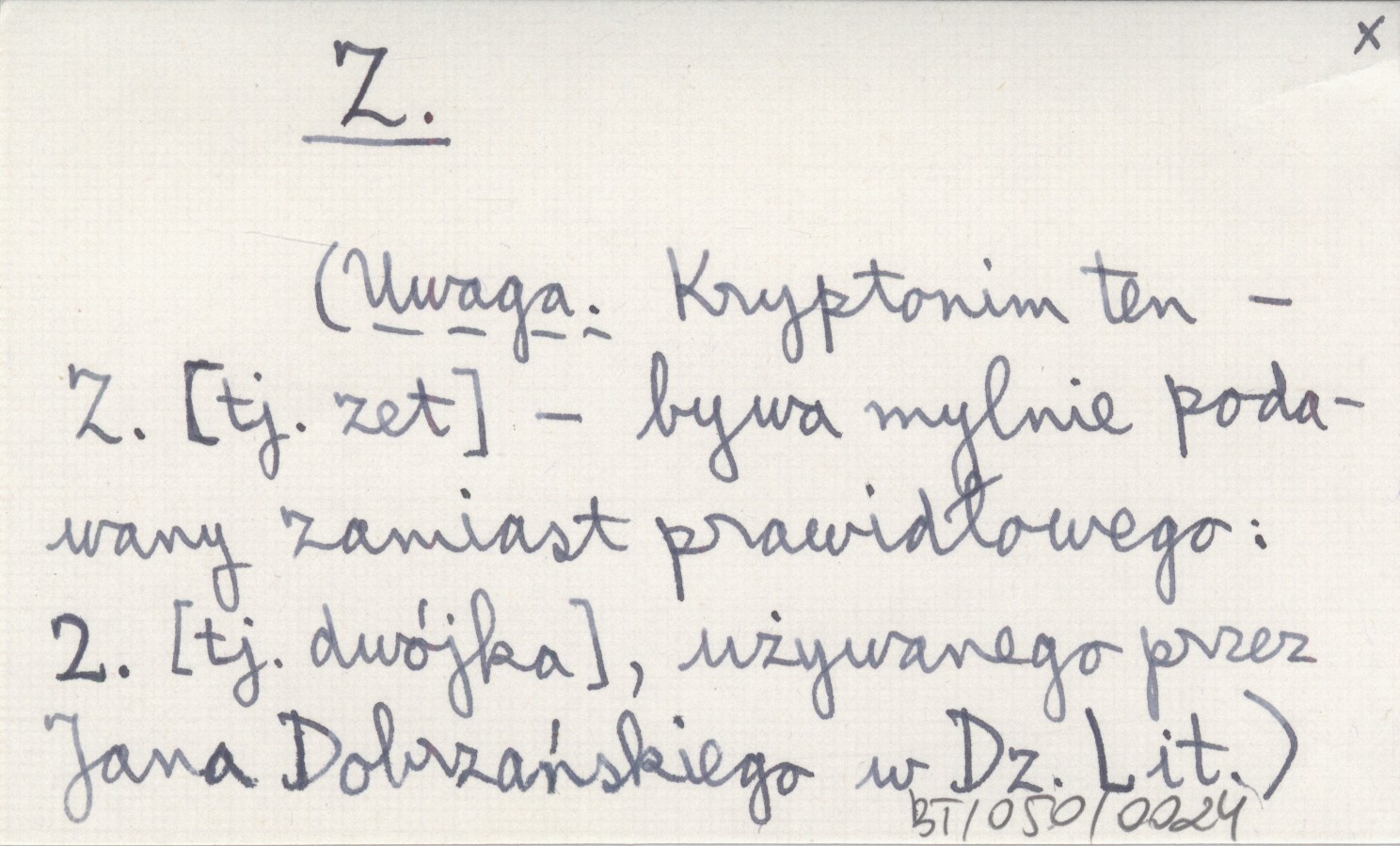 Z. Kryptonim ten - Z. [tj. zet] - bywa mylnie podawany zamiast prawidłowego: 2. [tj. dwójka], używanego przez Jana Dobrzańskiego w Dz. Lit.