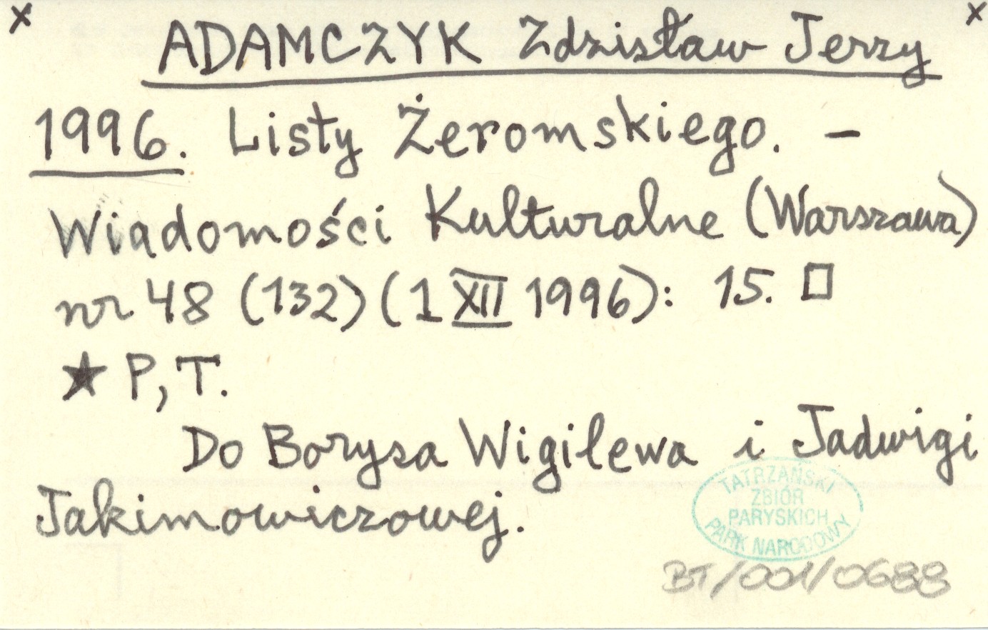 Wiadomości Kulturalne (Warszawa) , Nr 48 (132) (1 XII 1996): 15. Do Borysa Wigilewa i Jadwigi Jakimowiczowej.