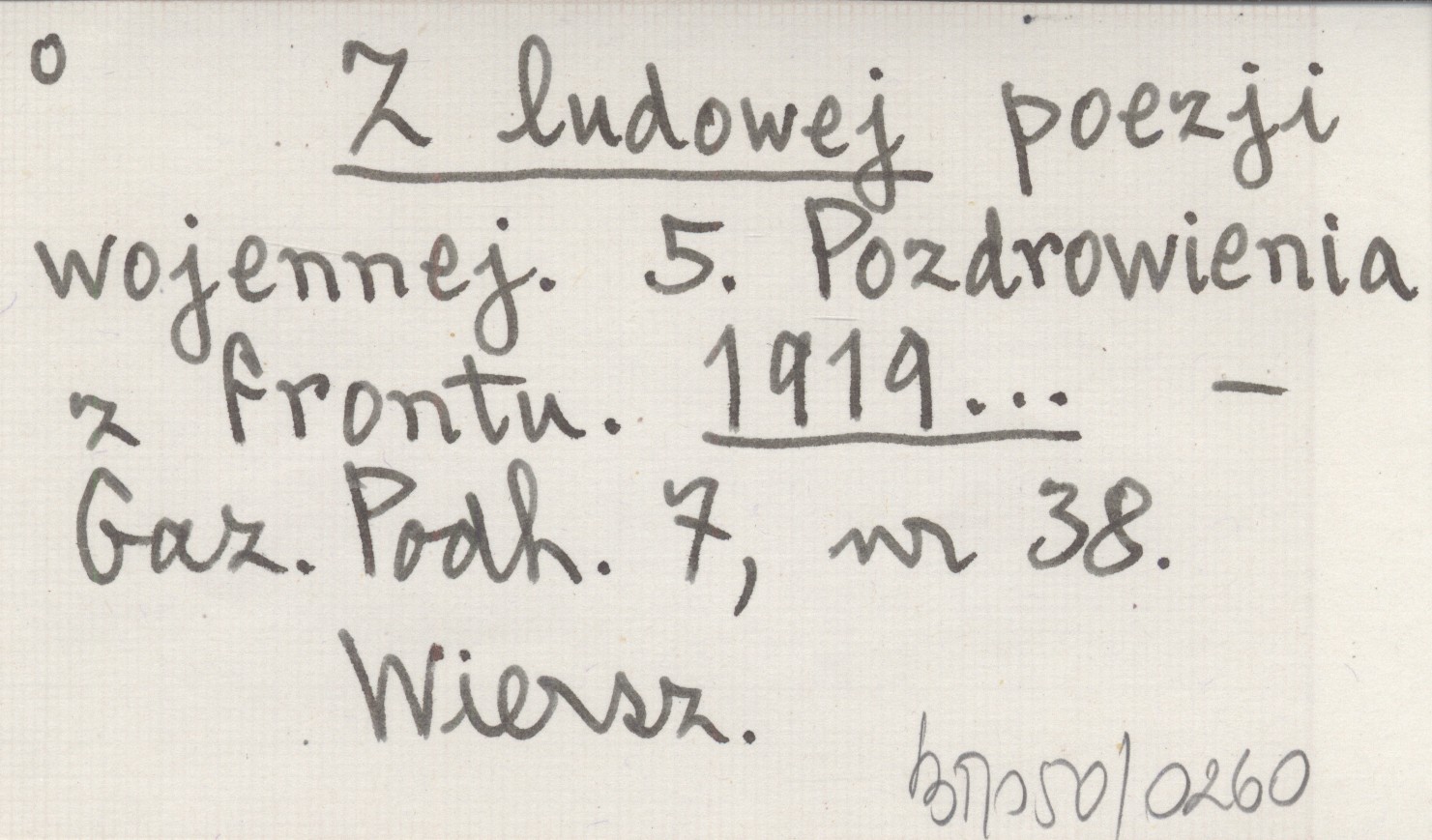 Z ludowej poezji wojennej. 5. Pozdrowienia z frontu. 1919...