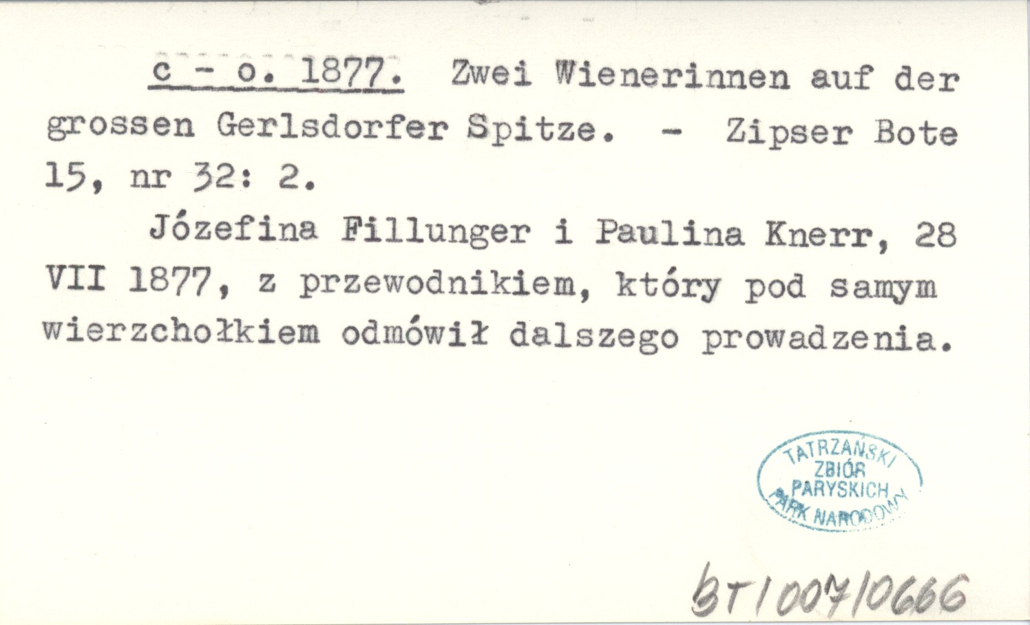 Zipser Bote, 15, nr 32: 2. Józefina Fillunger i Paulina Knerr, 28 VII 1877, z przewodnikiem, który pod samym wierzchołkiem odmówił dalszego prowadzenia.