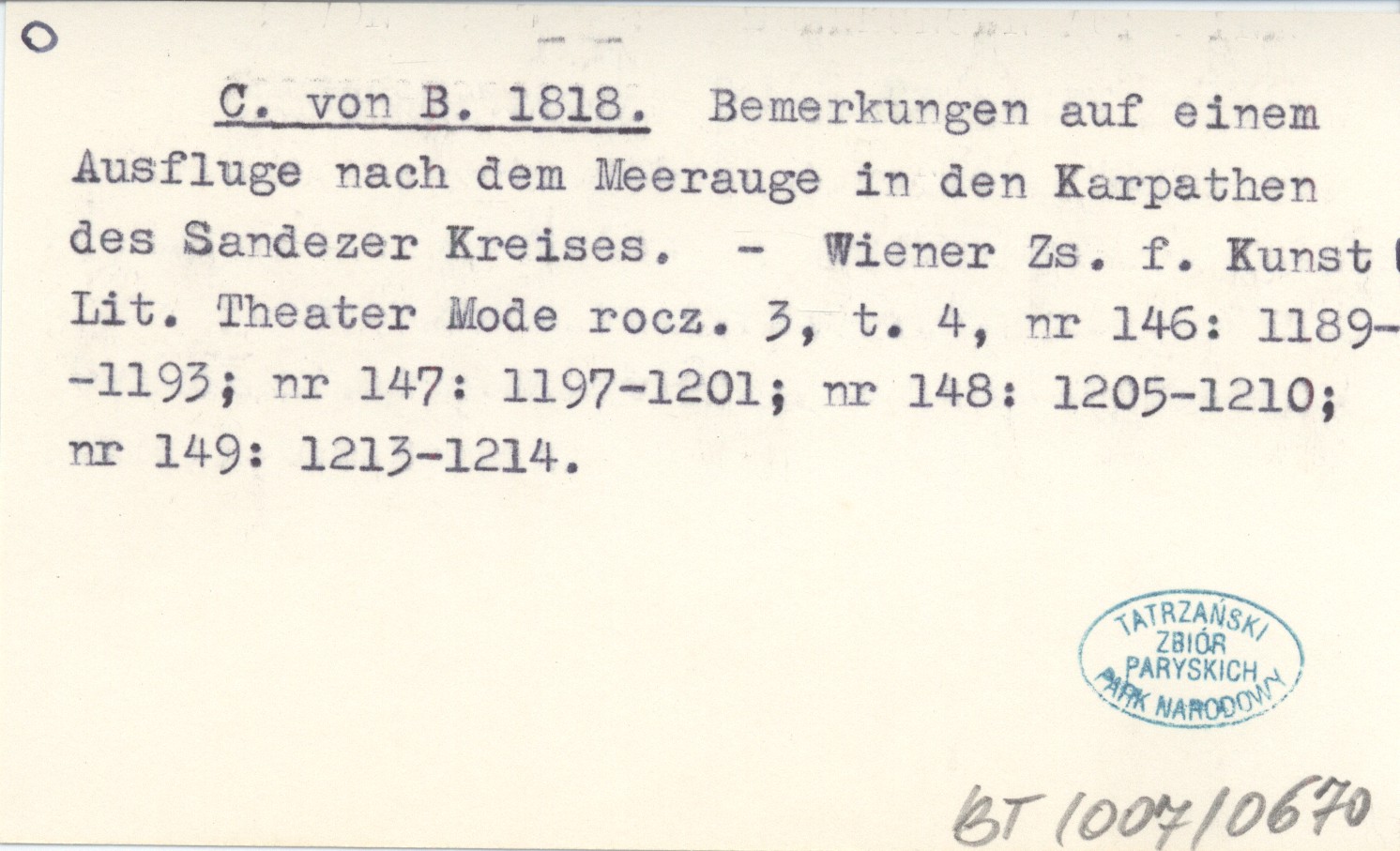 C. von B. 1818 Bemerkungen auf einem Ausfluge nach dem Meeraugen in den Karpathen des Sandezer Kreises.