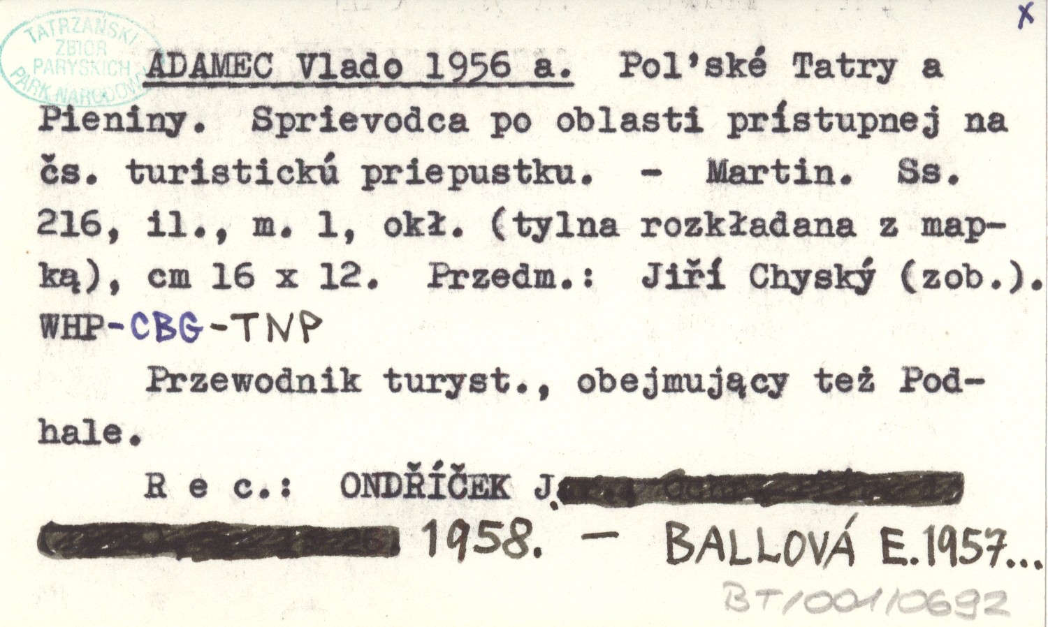 ADAMEC Vlado CHYSKÝ, Jiří. ; 1956 a Poľské Tatry a Pieniny. Sprievodca po oblasti prístupnej na čs. turistickú priepustku.