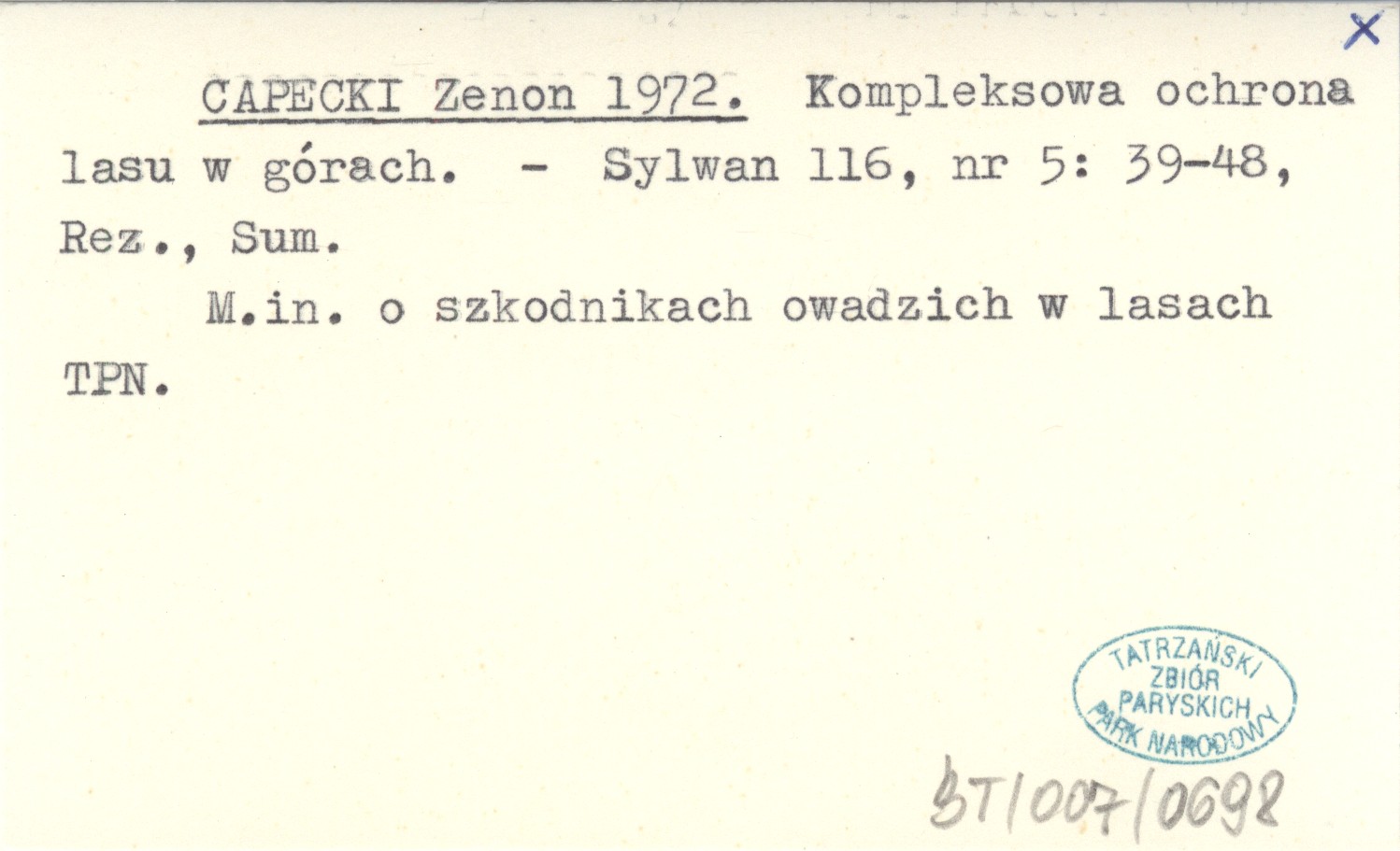 Sylwan, 116, nr 5: 39-48, Rez., Sum. M. in. o szkodnikach owadzich w lasach TPN.