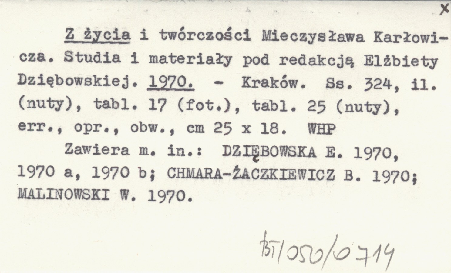 Kraków , 324 s., il. (nuty), 14 k. (fot.), 25 k. (nuty), err., opr., obw., 25x18 cm. Zawiera m. in.: DZIĘBOWSKA E. 1970, 1970 a, 1970 b, CHMARA-ŻACZKIEWICZ B. 1970, MALINOWSKI W. 1970.