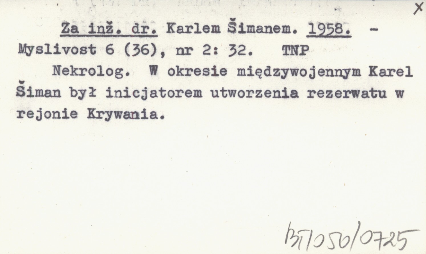 Myslivost, 6 (36), nr 2: 32. Nekrolog. W okresie międzywojennym Karel Šiman był inicjatorem międzywojennym rezerwatu w rejonie Krywania.
