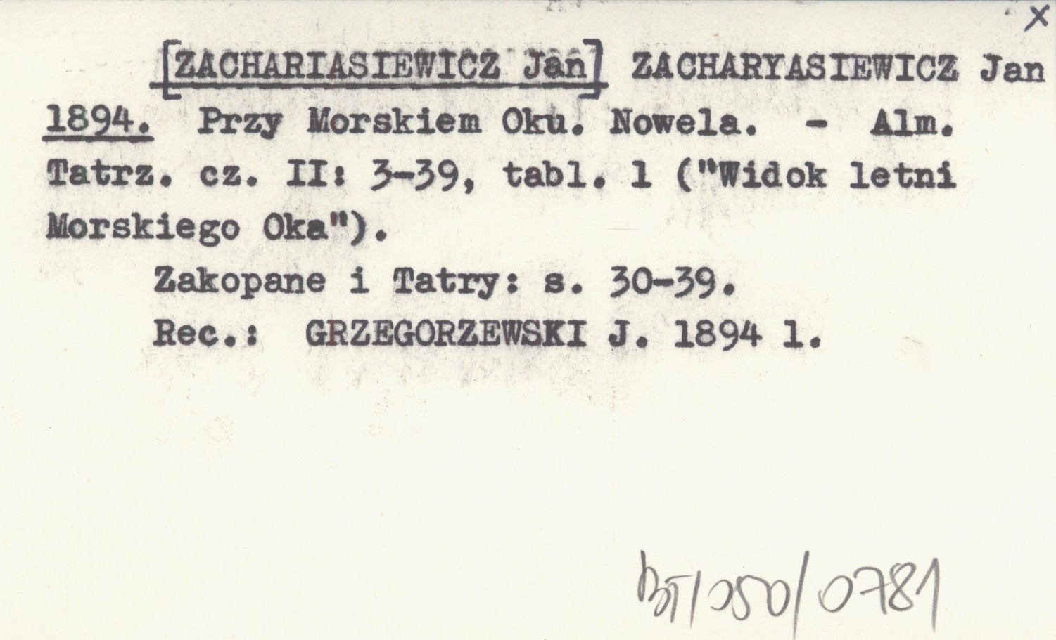 ZACHARYASIEWICZ Jan [ZACHARIASIEWICZ JAN] 1894 Przy Morskiem Oku. Nowela.