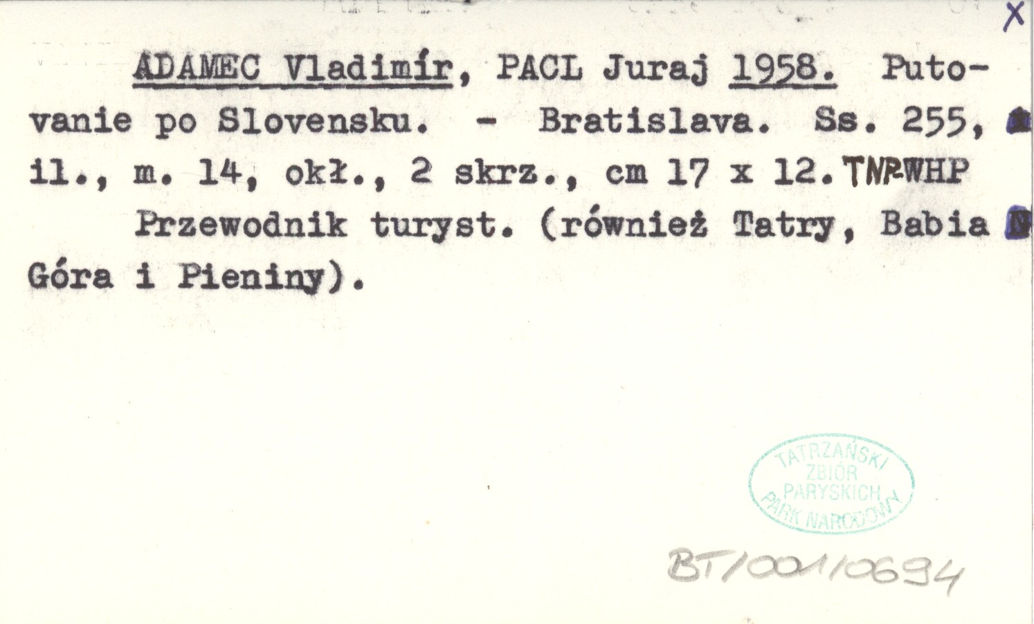 ADAMEC Vladimír PACL, Juraj. ; 1958 Putovanie po Slovensku.