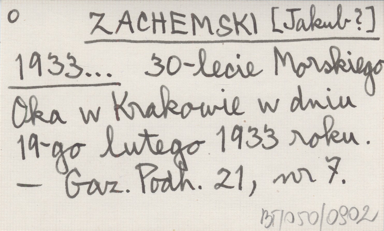 ZACHEMSKI [Jakub?] 1933... 30-lecie Morskiego Oka w Krakowie w dniu 19-go lutego 1933 roku.