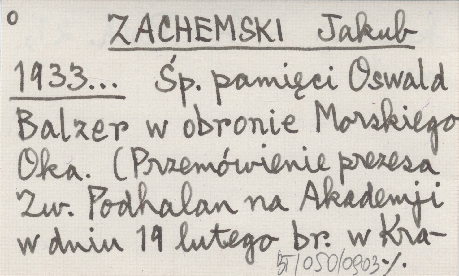 ZACHEMSKI Jakub 1933... Śp. pamięci Oswald Balzer w obronie Morskiego Oka. (Przemówienie prezesa Zw. Podhalan na Akademji w dniu 19 lutego br. w Krakowie).