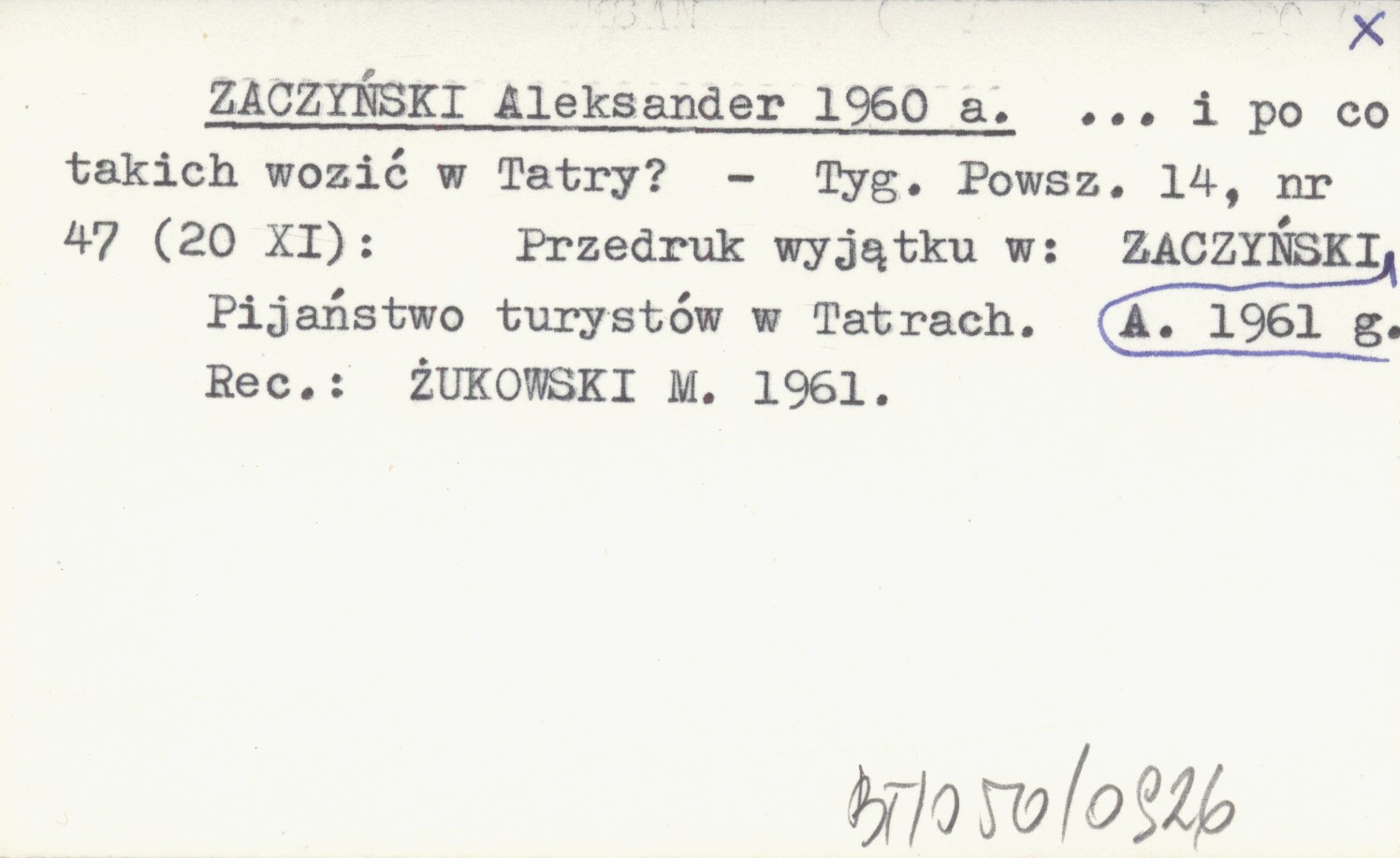 Tygodnik Powszechny, 14, nr 47 (20 XI). Pijaństwo turystów w Tatrach. Przedruk wyjątku w: ZACZYŃSKI A. 1961 g. REC: ŻUKOWSKI M. 1961. ZACZYŃSKI A. 1961 g