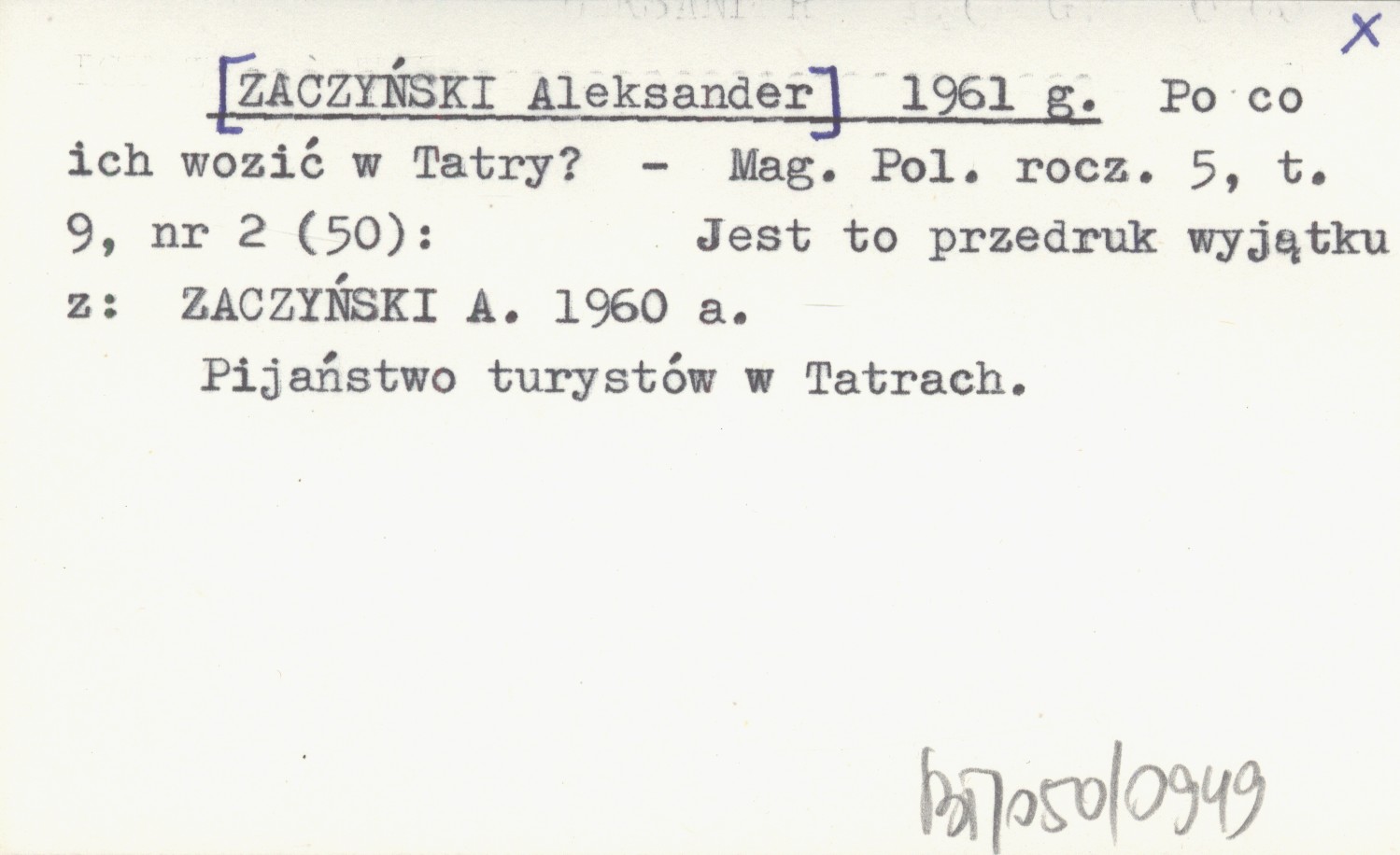 Magazyn Polski, R. 5, t. 9, nr 2 (50). Pijaństwo turystów w Tatrach. Jest to przedruk wyjątku z: ZACZYŃSKI A. 1960 a. ZACZYŃSKI A. 1960 a