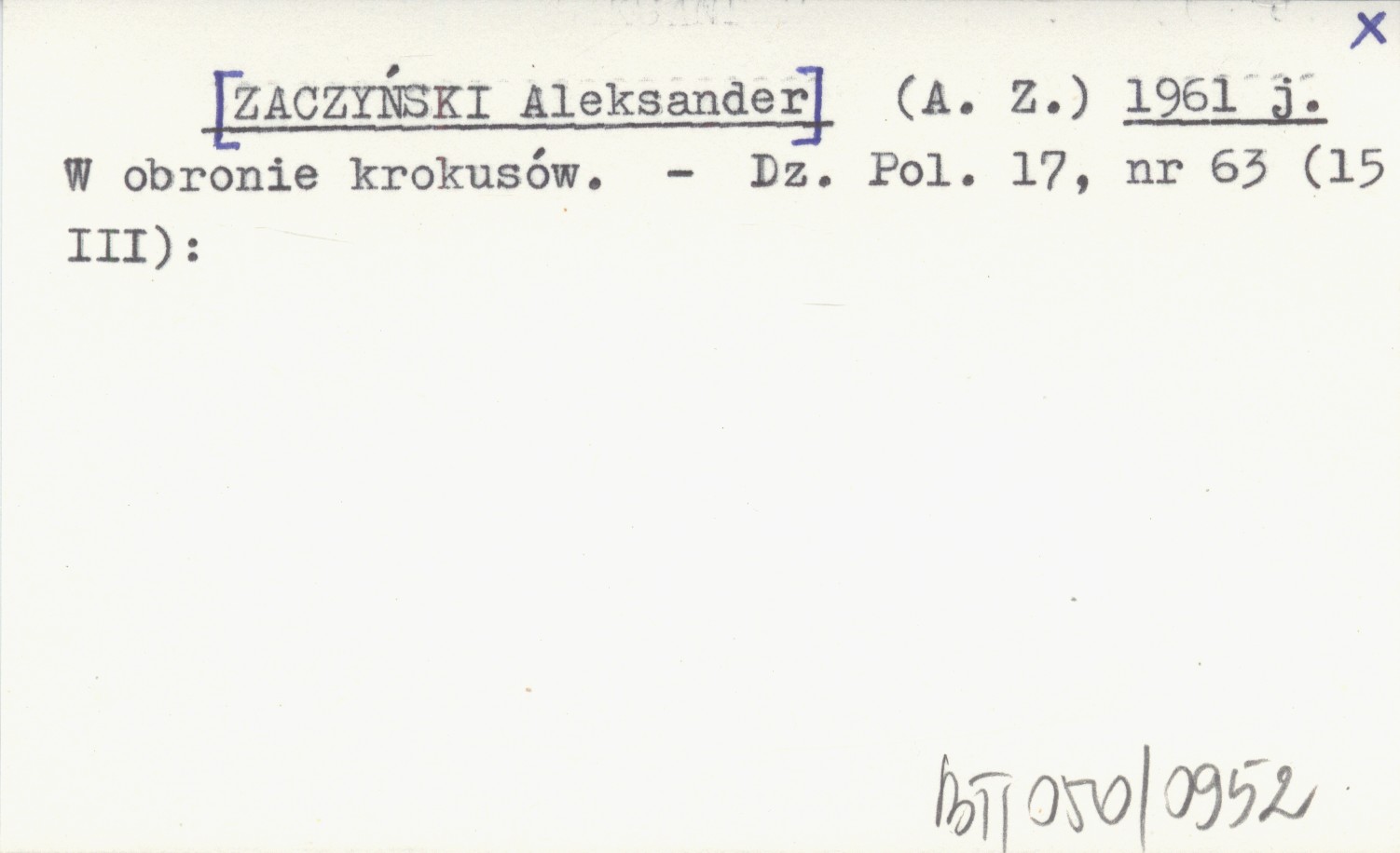 (A. Z.) [ZACZYŃSKI Aleksander] 1961 j W obronie krokusów.