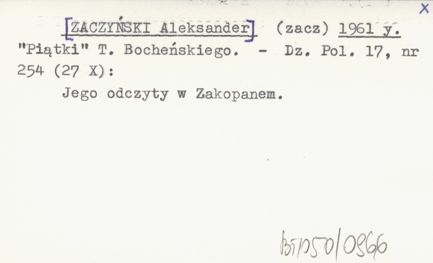 (zacz) [ZACZYŃSKI Aleksander] 1961 y "Piątki" T. Bocheńskiego.
