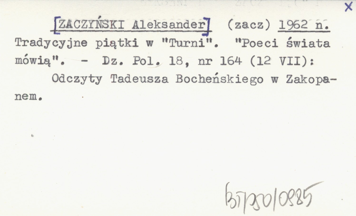 (zacz) [ZACZYŃSKI Aleksander] 1962 n Tradycyjne piątki w "Turni". "Poecie świata mówią".