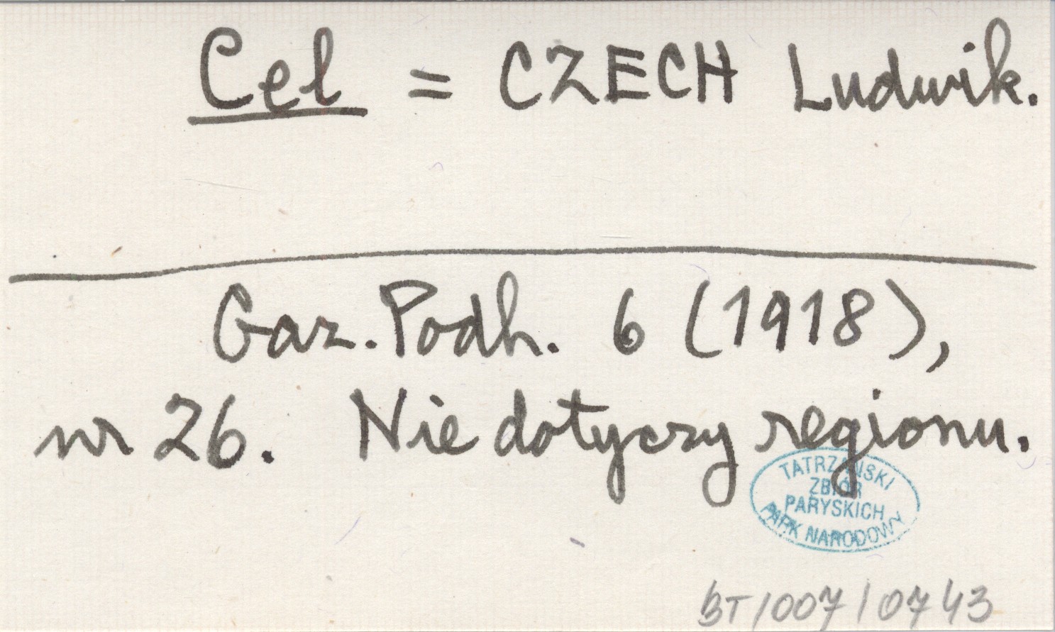 Cel CZECH Ludwik Gazeta Podhalańska 6 (1918), nr 26. Nie dotyczy regionu.